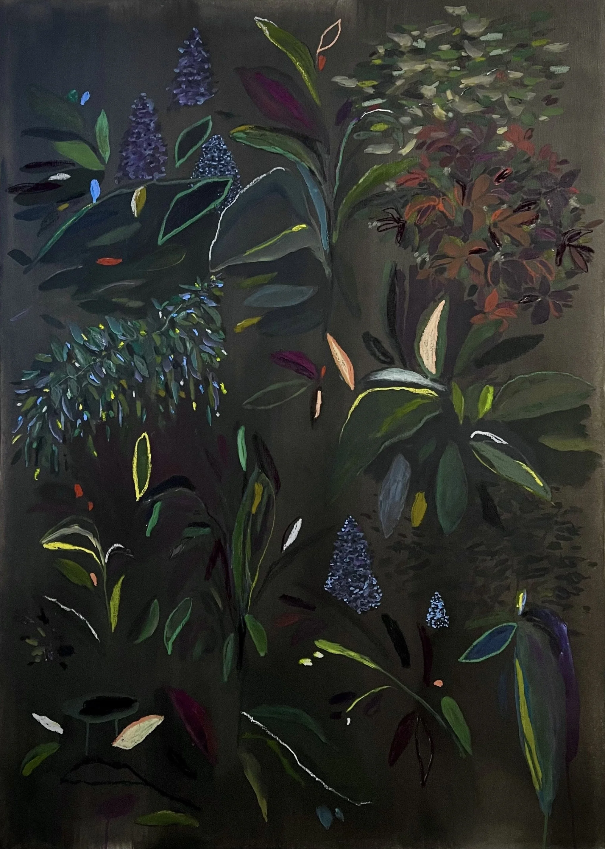 In the Nocturne paintings, leaf-like shapes rendered through quick brushstrokes, drips and patterns, elicit a sense of movement and musicality, while some parts are conceiled by shadow and night.