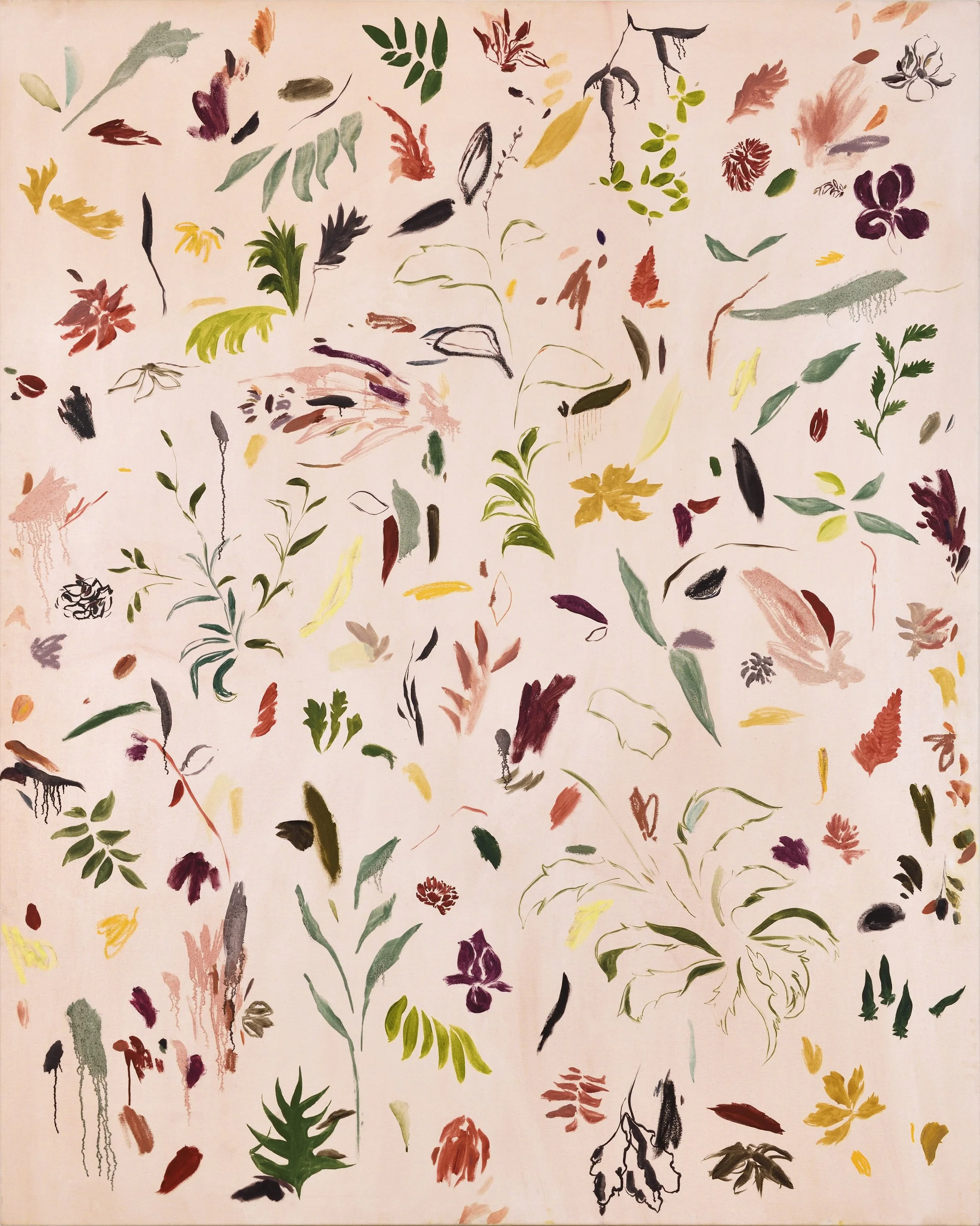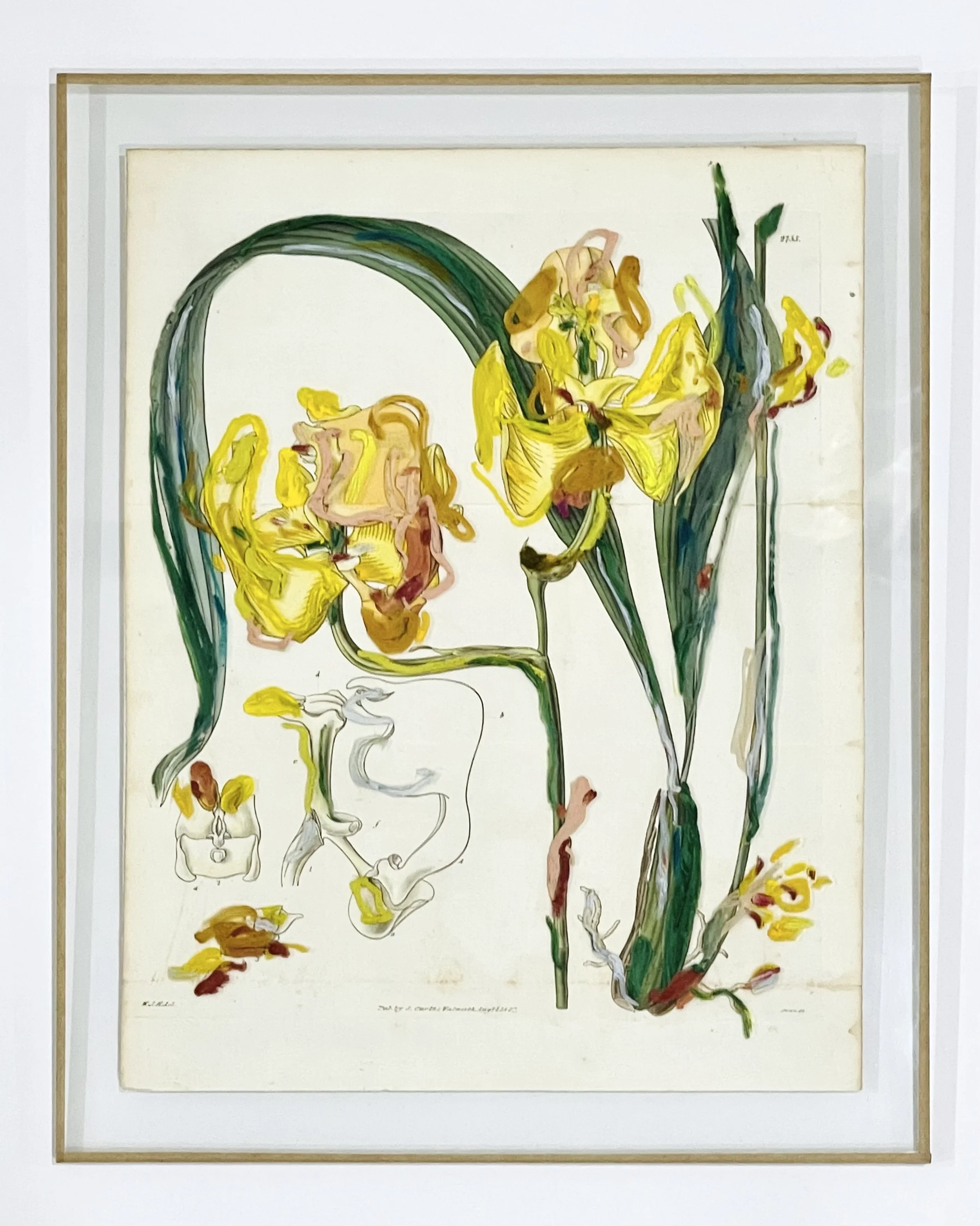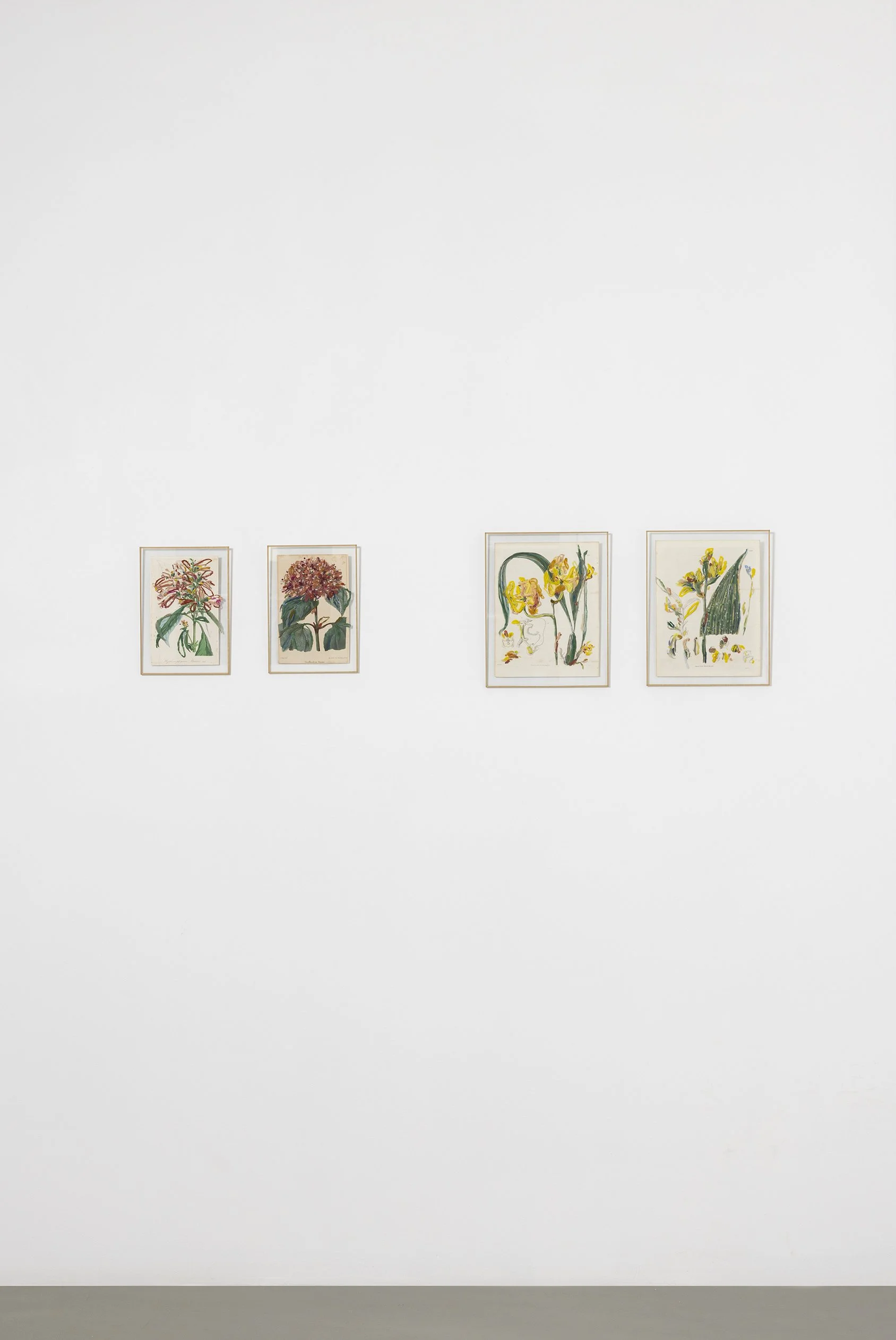 In Recaptured Flora, a series of chromolithographs are overlayed with painted glass, doubling the pattern of the vegetal with oil stick to enhance the subjective perception of forms and colors.