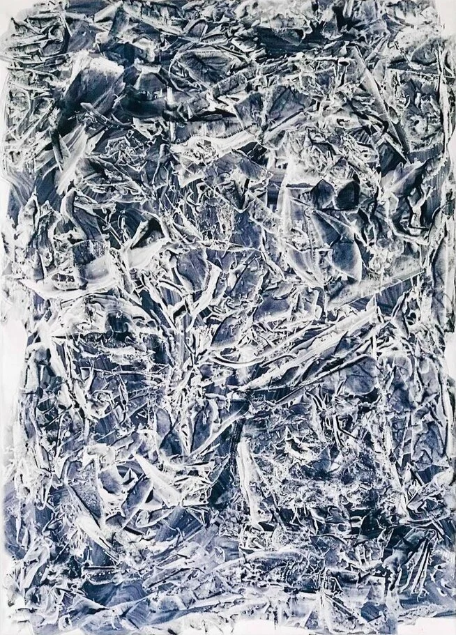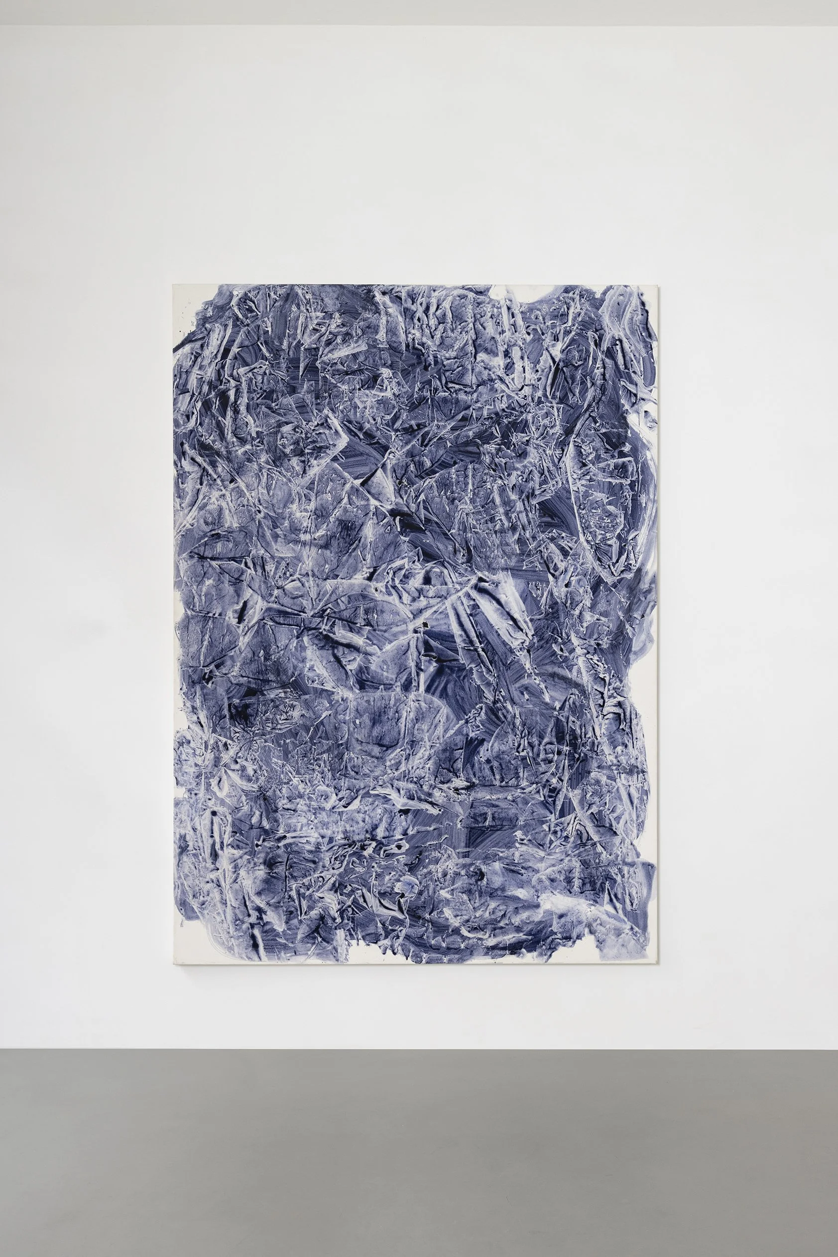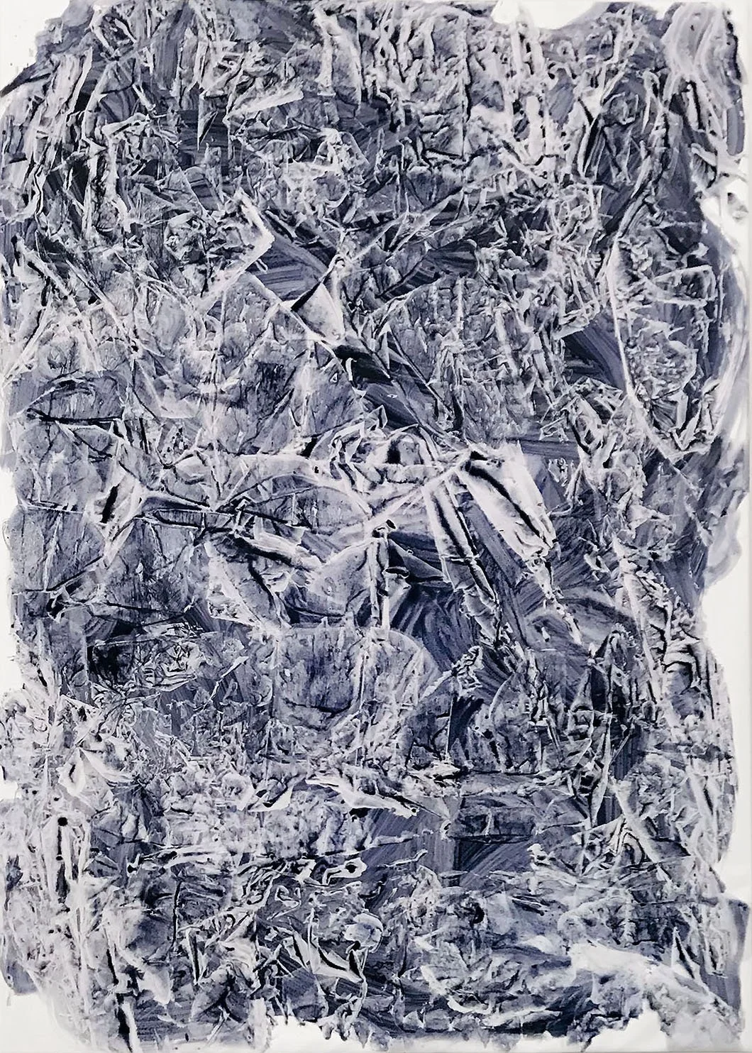 Her Payne monochromes draw inspiration from a tone of grey used to depict shadows with more delicacy. Layered oil pastel soaked in turpentine are imprinted on canvas with successive folds of plastic.