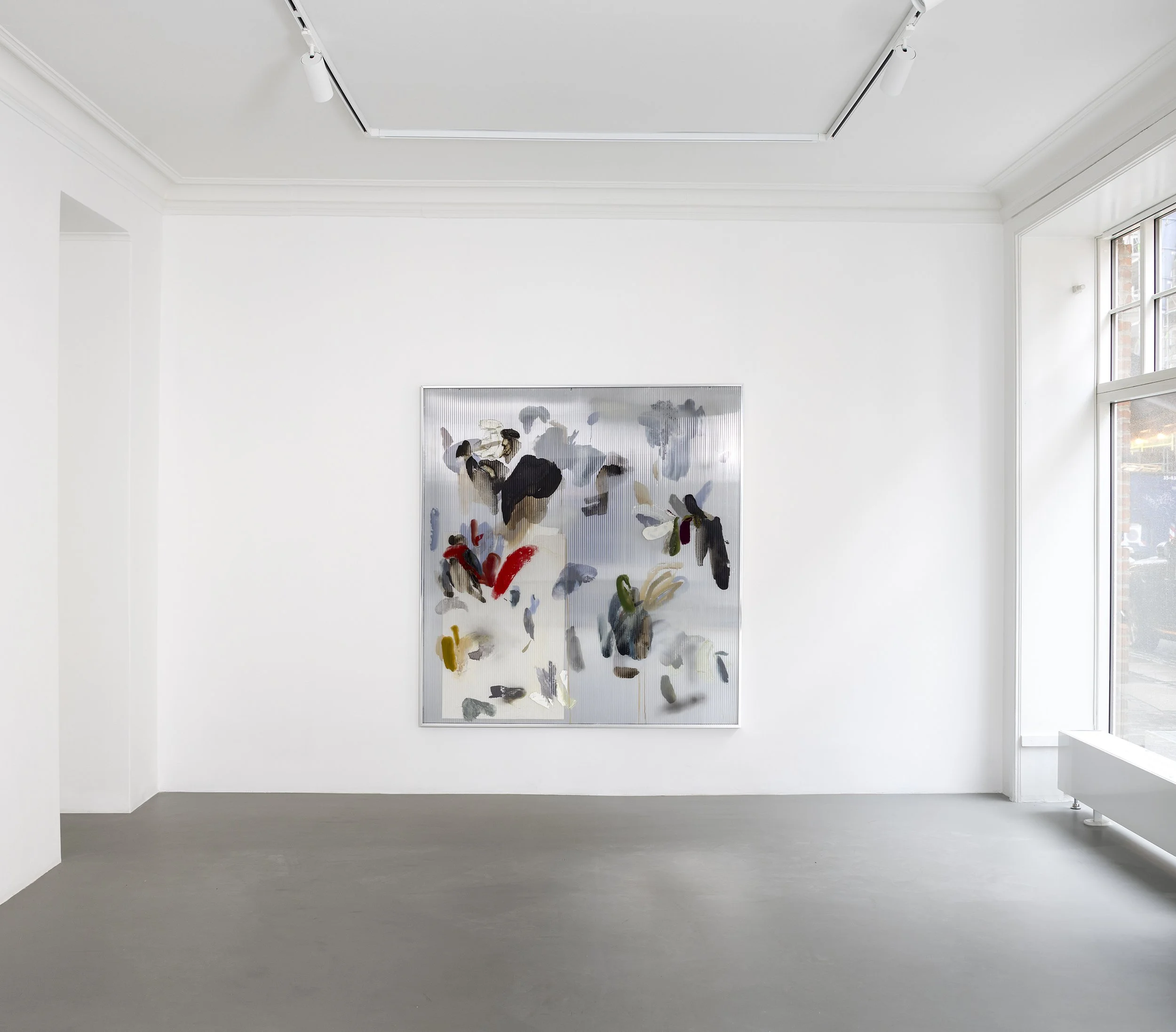 The modular paintings on Polycarbonate use corrugated panel and mirror to suspend painterly gestures on a translucent ground, while the ridged surface marks the site around it with geometric awareness.