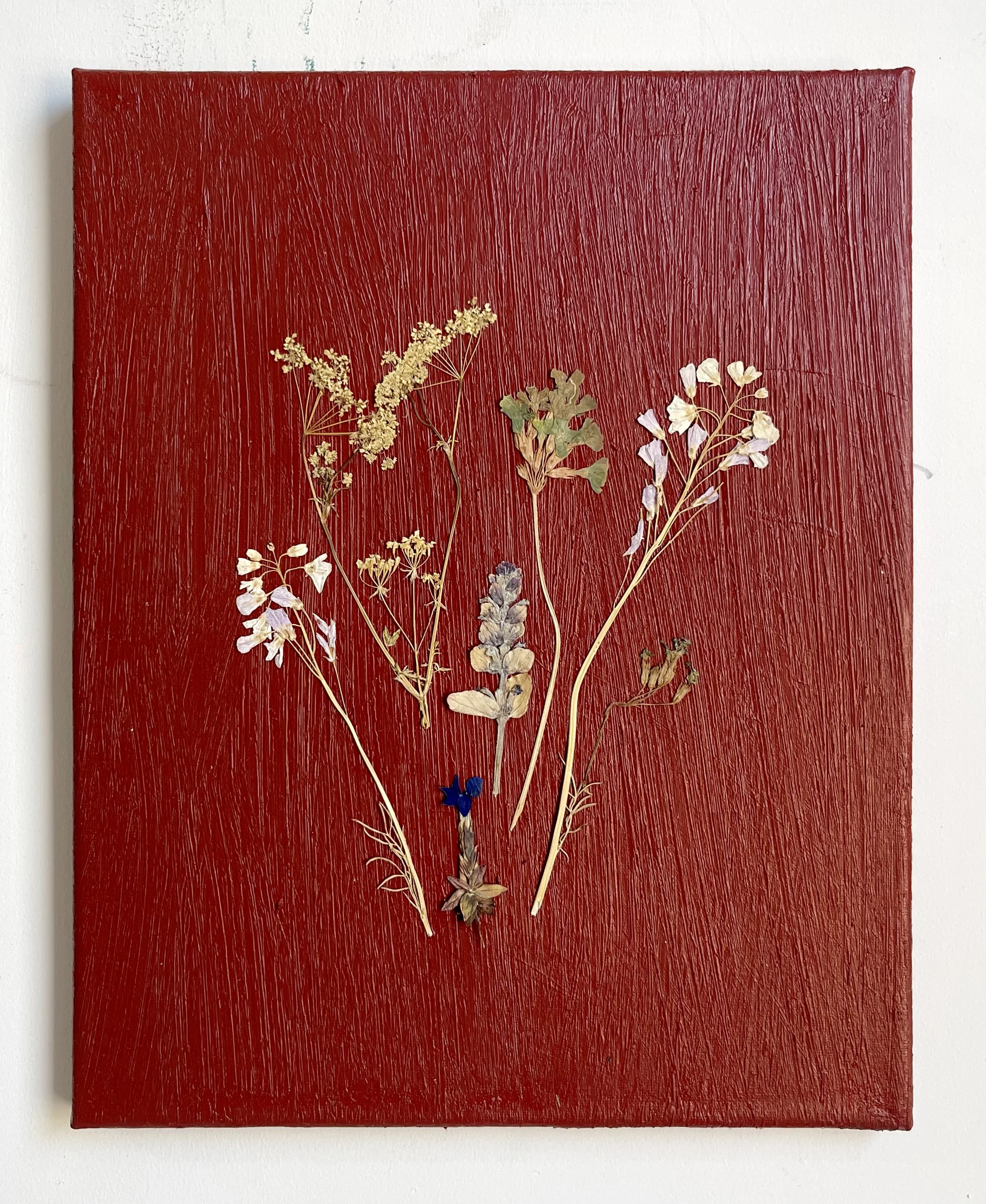In Alpine Flowers, the canvas is coated with Pompeian Red and adorned with dried plants from the Swiss mountains. Of inorganic origin, the hue erupted s as the intense heat transformed the walls painted with yellow ochre into red ochre.