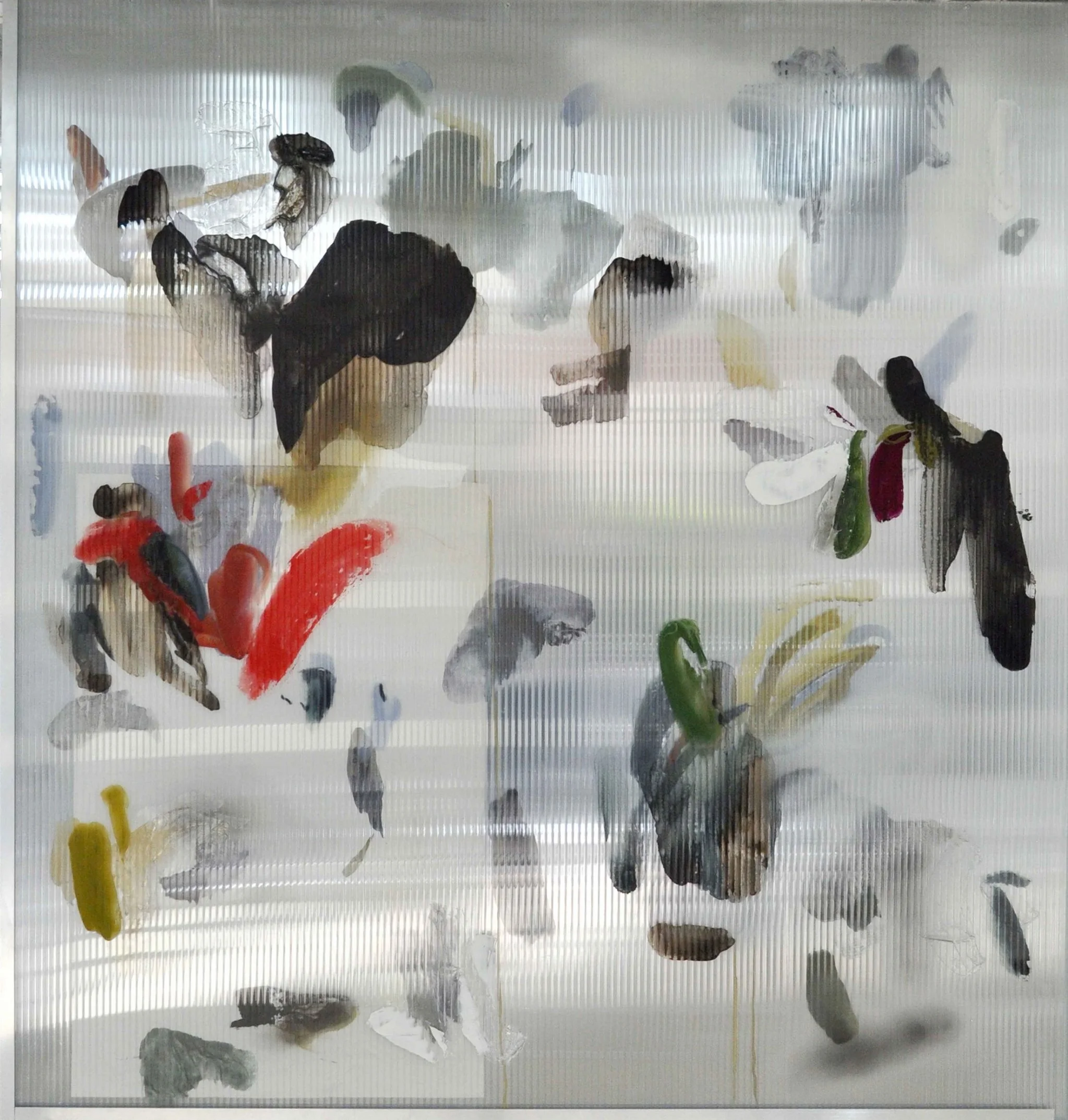 ink, gouache, oil, marker, aerosol on polycarbonate, two-way mirror, aluminum frame, 105 x 75 cm