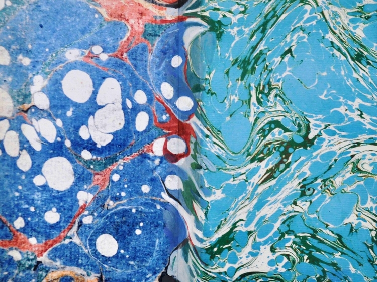 Ecritures takes its inspiration from the inside covers of the historical books Chateaubriand in which were published his 'Nights'. I photographed the inside covers of each of the seven books (dated from 1797, 1801, 1802, 1809, 1827, 1848) in the author's library in Châtenay-Malabry, France. I assembled them two by two mixing the editions and painted the intersection between the pages.